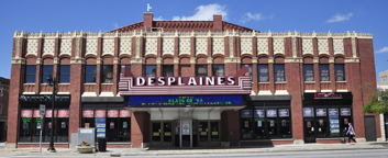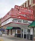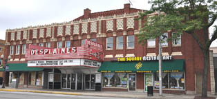The Des Plaines Theatre opened as a vaudeville house in 1925. In 1935, it was remodeled as a movie house. In 1982, a fire nearly destroyed the theater, but it was reopened a couple of years later. It closed in 2008 and reopened later as a performing arts venue. In 2018, the City purchased the theatre. In 2019, the marquee was replaced with a replica with LED tubing. The poster display cases were removed. In 2021, the theatre reopened with live performances. For more, see these websites: 1, 2, and 3. [map]